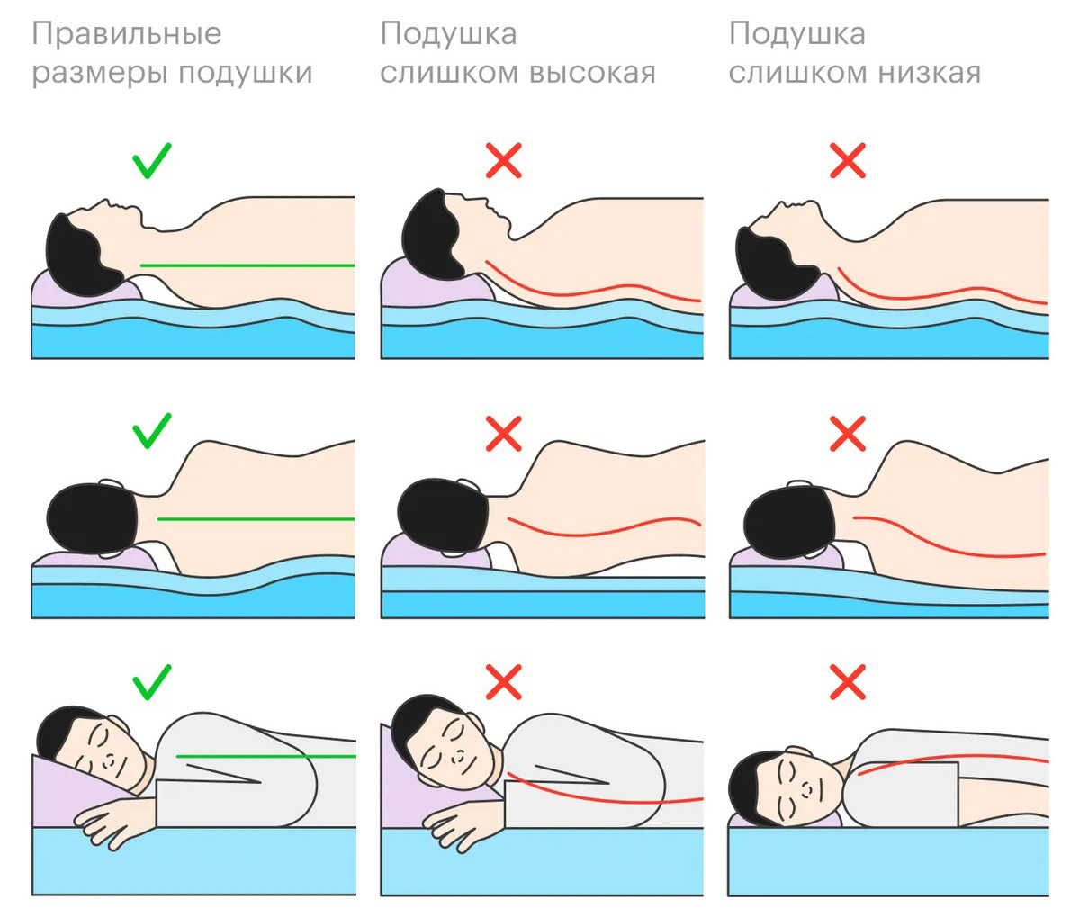 - Очень важно сохранять правильное положение головы и шеи во время сна. Если вы любите спать на боку, то вам нужна подушка такой же высоты, как ширина вашего плеча. Любителям спать на спине нужна подушка средней толщины, чтобы выровнять голову и шею. Обратите внимание на ортопедические контурные подушки с дополнительной поддержкой. В любом случае позвоночник должен находиться на одной линии от шеи до нижней части спины.