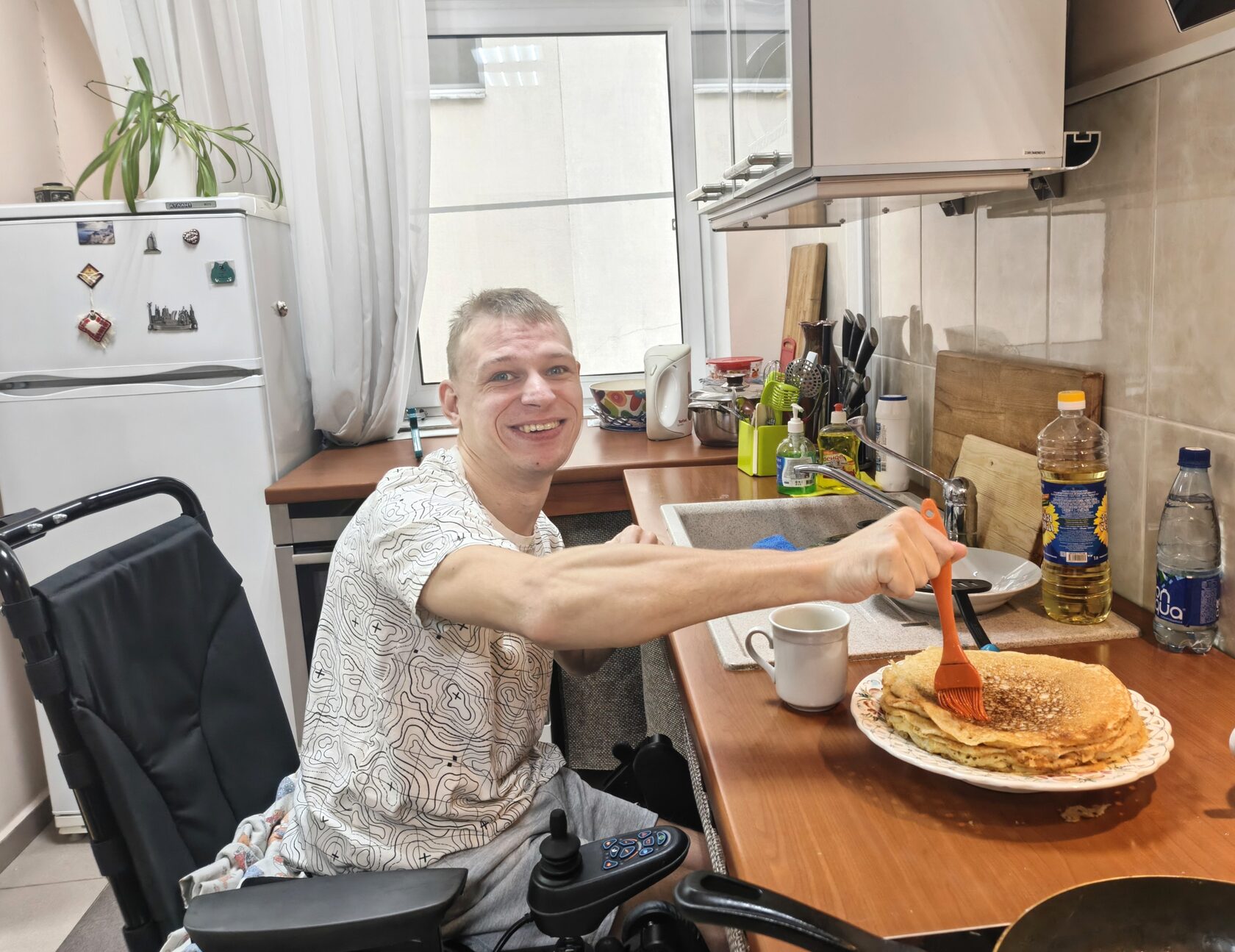 Но главное волшебство, как водится, случилось в нашей кулинарной мастерской. Здесь вчера кипела работа: пекли блины - румяные, кружевные, пышные. И это не просто кулинария, а важный этап реабилитации. Для кого-то процесс приготовления теста — это возвращение утраченного навыка, а для кого-то — первое в жизни кулинарное достижение. Замесить тесто, правильно налить его на сковороду, вовремя перевернуть — эти простые на первый взгляд действия требуют колоссального терпения, когда руки не слушаются, а блин так и норовит выскользнуть. Но наш специалист Галина Борисова знает главный секрет: любое дело можно адаптировать. В ход идут удобные лопатки с прорезиненными ручками, нескользящие миски и другие лайфхаки, которые делают невозможное возможным.